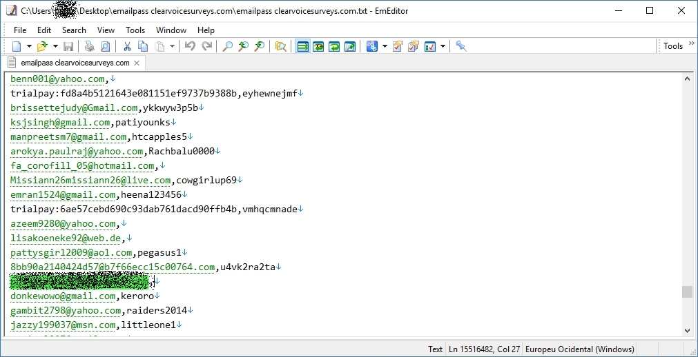 Note: My email is include in this database and after verification with Email-Pass Version the email exists but not the password. Some emails have the password field empty.