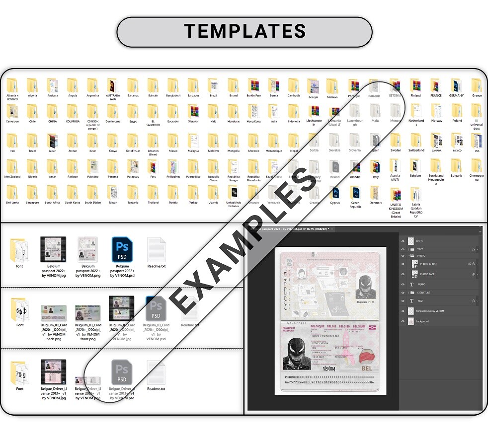 Additionally you can find in my assortment of different training materials (theory + practice), instructions and manuals on rendering, documents, working with templates and Photoshop (Photoshop). Photodrop kits (there are more than 150+ ready-made kits available, there is an option to customize a photo shoot with a drop kit). Photos/scans of real documents (eu/usa/asia) for various purposes (over 1000 sets available).