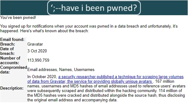 In October 2020, a security researcher published a technique for scraping large volumes of data from Gravatar, the service for providing globally unique avatars. 167 million names, usernames and MD5 hashes of email addresses used to reference users' avatars were subsequently scraped and distributed within the hacking community. 114 million of the MD5 hashes were cracked and distributed alongside the source hash, thus disclosing the original email address and accompanying data.